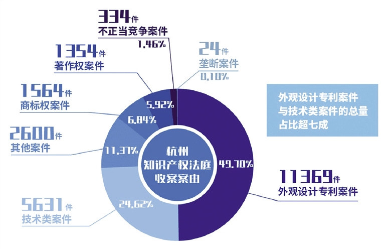 Hangzhou IP Court’s case breakdown: patent cases dominate, but copyright-related cases are on the rise. Source.